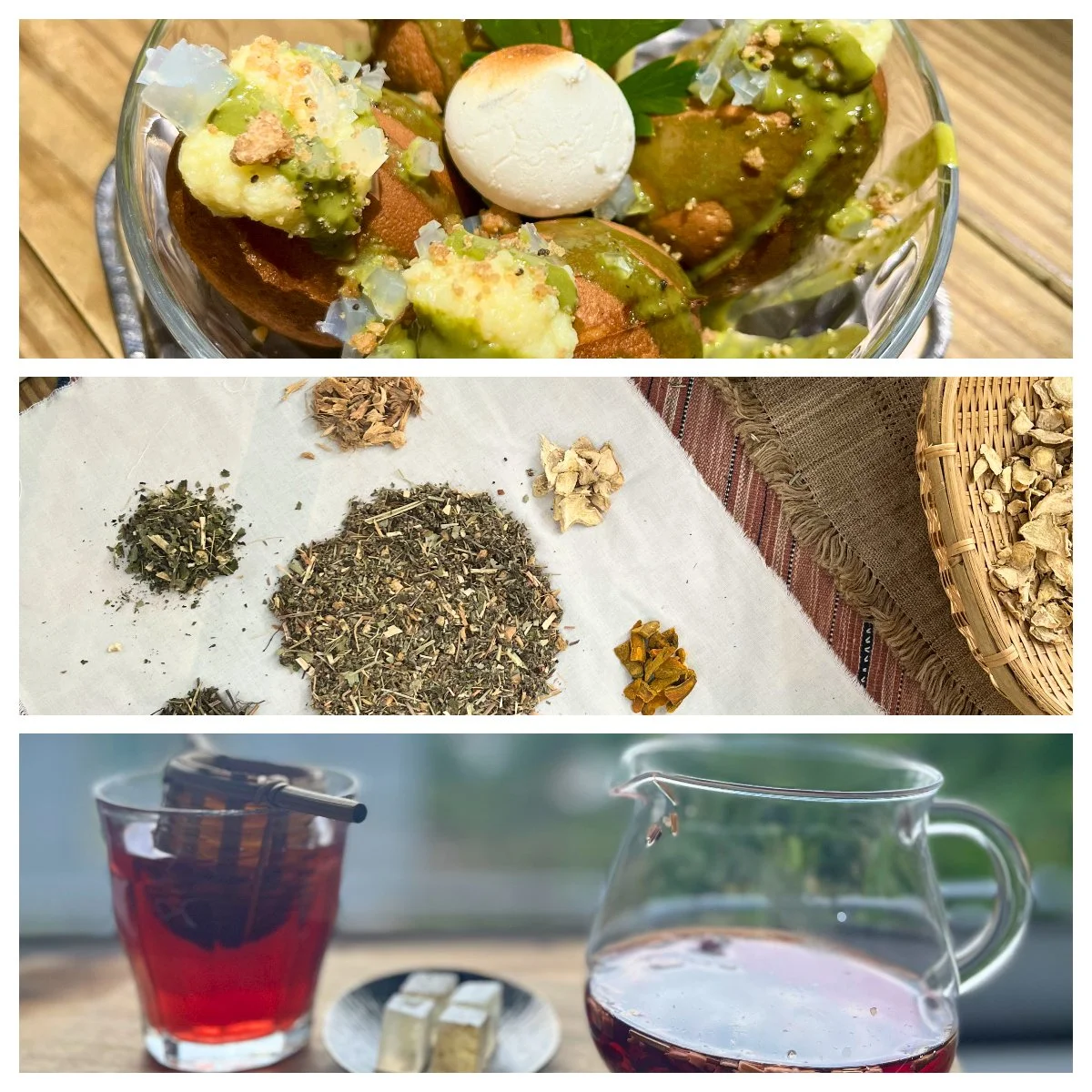 青草茶 (百草茶) — Herbal Blend Tea The house drink of almost every herb shop. A rotating mix of mint, dried grass jelly plant, holy basil, and wild greens — cooling, lightly sweet, and built for hot days. Think of it as the original sports drink, minus the neon.